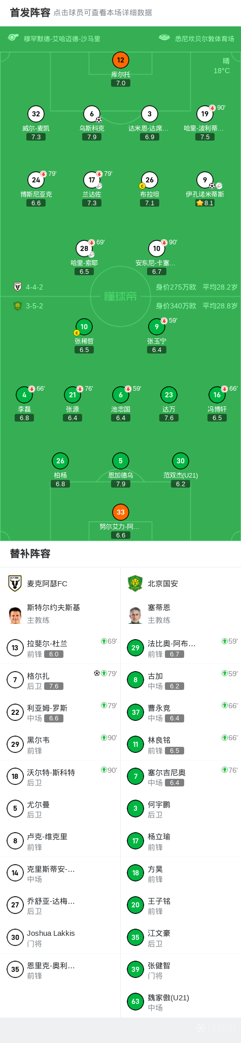 第58分钟,兰达佐送出传中,乌斯科克在无人防守的情况下抓住机会破门得分,国安0-2麦克阿瑟